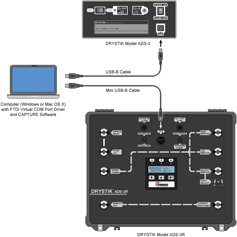 Once the appropriate driver has been installed, connect the DRYSTIK to the computer as shown in Figure 1, below. The DRYSTIK model ADS-3 uses a USB-B cable, while the DRYSTIK ADS-3R requires a Mini USB-B cable. Next connect the DRYSTIK's power supply and power the unit On. Finally, launch CAPTURE. As the program starts up it will automatically detect any connected DRYSTIK(s). An icon representing each DRYSTIK will appear in the row of toolbar items alongside any connected RAD7s. As with RAD7s, DRYSTIKs can be added, renamed, disconnected, and reconnected using the toolbar menu commands. Unlike RAD7s, DRYSTIKs always communicate with the computer at 9600 baud, so there is never any need to specify the connection speed when manually connecting to a DRYSTIK. |