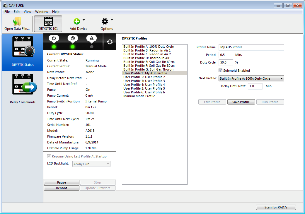 CAPTURE can connect not only to the RAD7, but also to the Durridge DRYSTIK active moisture exchanger. Compatible DRYSTIK models include the ADS-3 and ADS-3R, which connect to the computer via USB, with no serial adaptors required. A driver is required in order to communicate with the DRYSTIK; it is the same one used to connect to a RAD7 via the StarTech USB to Serial Adaptor. If necessary this driver can be downloaded from the Durridge website. Be sure to install the appropriate version of the driver based on your operating system. |