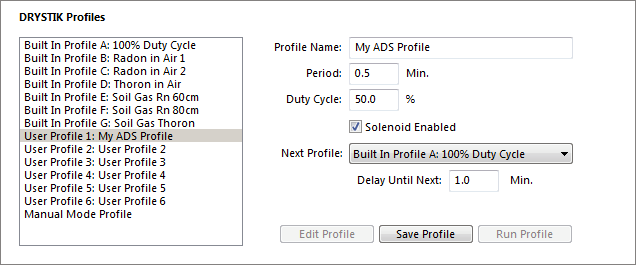 The right side of the DRYSTIK interface contains controls for configuring and running DRYSTIK profiles, as shown in Figure 3. The DRYSTIK Profiles listbox includes the names of each Built In Profile and User Profile stored in the DRYSTIK, plus a "Manual Mode Profile" which is used when custom settings are needed. To run a profile, select its name in the list and click the Run Profile button on the right. (Profiles can also be selected and run using the membrane switch interface and LCD display on the DRYSTIK itself.) |