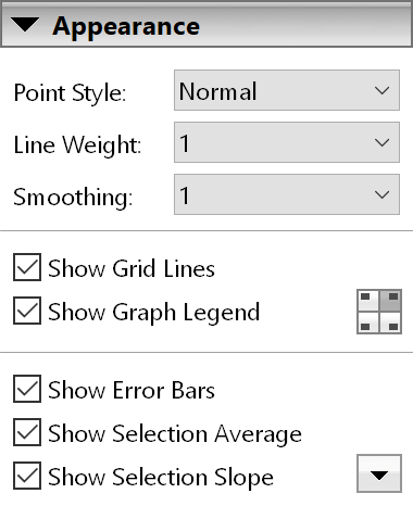 The Graph Controls panel is used the to navigate the graph and change its behavior and appearance. Although much of its functionality is also accessible from within the menu bar, you may find that the Graph Controls panel provides easier access to commonly used functions. This scrollable panel consists of a series of sub-panels, labeled Configuration, Appearance, Navigation, Graph Lines, and Windows and Panels. Each may be expanded or collapsed by clicking on its heading. The panels are described below. Configuration Panel