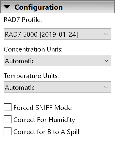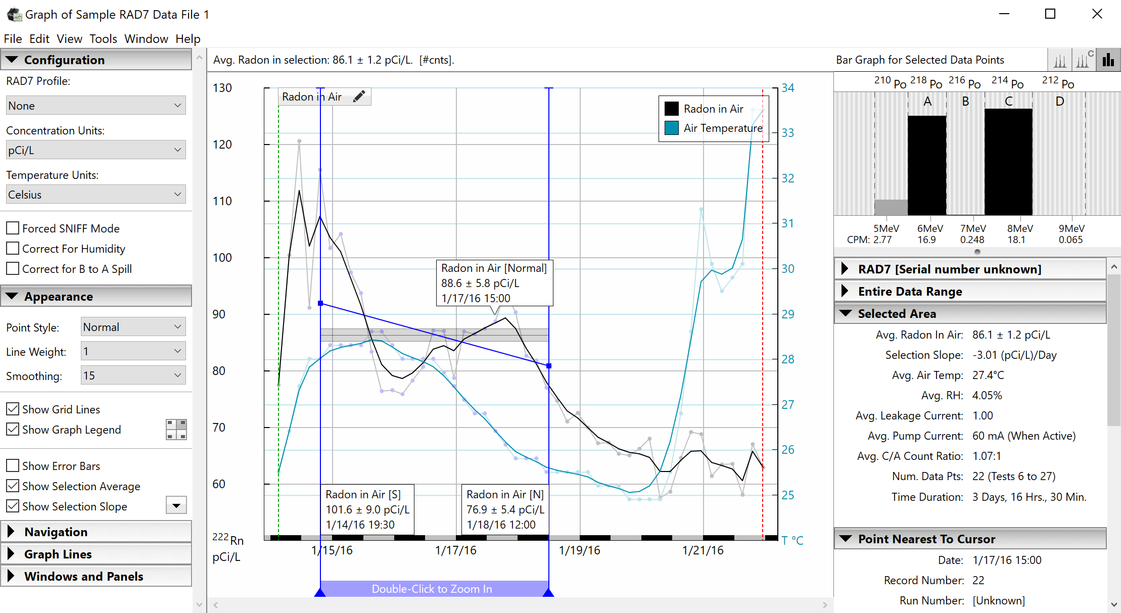 RAD7 Profile Pop-Up Menu RAD7 Profiles contain sensitivity information and spill factor values that allow RAD7 data to be more accurately parsed and presented. CAPTURE maintains a collection of RAD7 Profiles, and they are created automatically as needed. When a RAD7 data file is opened, CAPTURE will select an appropriate profile, with respect to which RAD7 produced the data, and when the data was recorded. This selection may be overridden if desired using the RAD7 Profile pop-up menu. The collection of RAD7 Profiles may be edited in the Preferences Window, as described in the Preferences Window section. Concentration Units Pop-Up Menu Determines the unit of measurement used to denote radon and thoron concentrations on the graph. The available options include Automatic, Bq/L, Bq/m3, dpm/L, and pCi/L. The Automatic option causes radon and thoron concentrations to be presented in the unit in which they were originally recorded inside the RAD7. Temperature Units Pop-Up Menu Determines the unit of measurement used to denote air and water temperatures on the graph. The available options include Automatic, Celsius, Fahrenheit, and Kelvin. The Automatic option causes temperatures to be presented in the unit in which they were originally recorded inside the RAD7. Forced SNIFF Mode Checkbox Determines whether the graph data is forced to be displayed as if it was recorded in SNIFF Mode. This checkbox is enabled whenever there exists at least one record that truly was recorded in SNIFF Mode. Such records are analyzed to determine the necessary SNIFF sensitivity data. Correct For Humidity Checkbox Determines whether the graph data is corrected for humidity. When relative humidity is high, radon concentration values are often underreported. Humidity correction compensates for this. Correct for B to A Spill Checkbox Determines whether correction is applied based on the spill from the B to A windows. Significant spill occurs when the thoron concentration is high relative to the radon concentration. Under these conditions it is recommended that the data be corrected to compensate. Appearance Panel ![]() Figure 3: The Appearance Controls Panel Point Style Pop-Up Menu Determines the appearance of the data points on the graph. The options are Normal, Shapes, B&W (Black and White) Shapes, and Hidden. The B&W Shapes option causes the graph to be rendered in black and white, which is useful when graph image is printed on a non-color printer. Line Weight Pop-Up Menu Determines the thickness of the graph lines, as measured in pixels. This value may range from 1 to 4, or the graph lines may be hidden. A thicker line may be easier to read, but is somewhat less precise than a single-pixel line. Smoothing Pop-Up Menu Determines the degree of smoothing applied to the graph line. This value may range from 1 (no smoothing) to 9 (high smoothing). When the degree of smoothing is greater than 1, the original, non-smoothed graph line appears faded in the background. Show Grid Lines Checkbox Determines whether horizontal and vertical grid lines are visible on the background of the graph. Grid lines are drawn at regular intervals, with vertical lines representing time intervals, and horizontal lines representing concentrations, temperatures, and humidity levels. Show Graph Legend Checkbox Determines whether the legend is visible on the Graph Window. The legend indicates the significance of the colors that appear on the graph. To the right of the Show Graph Legend Checkbox is a small control for setting the position of the Graph Legend. It may be placed in any of the four corners of the graph image. Show Error Bars Checkbox Determines whether error bars are visible on the graph. Error bars are vertical line segments which pass through data points, indicating the uncertainty of radon and thoron readings. Show Selection Average Checkbox Determines whether a representation of the average of the selection is displayed between the Selection Bars. A horizontal line represents the average of the selection, and a shaded region represents the uncertainty of the average. Separate representations appear for Radon, Thoron, Radon in Water, and Thoron in Water. Show Selection Slope Checkbox Determines whether the Selection Slope Line is visible on the graph. This checkbox may be checked or unchecked, or it may be set to an intermediate partially checked state, in which case the Selection Slope Line only appears if the selection contains a series of fairly evenly distributed data points. The Selection Slope Line starts at the first Selection Bar and ends at the second Selection Bar. The default angle of the Selection Slope Line is based on a linear regression formula accounting for the distribution of the selected data points. However the line's endpoints may be dragged manually to modify the position and angle of the line if desired. If the line is adjusted manually, it will change from blue to red to indicate that a modification was made. The line's slope is stated in the Statistics panel, where it is expressed as a change in radon or thoron concentration per unit of time. The pop-up menu control to the right of the Show Selection Slope Checkbox is used to specify the time unit used in this expression. The time unit may be set to either Automatic, Months, Days, Hours, Minutes, or Seconds. Navigation Panel ![]() Figure 4: The Navigation Controls Panel Graph Zoom Slider Zooms the radon graph in and out. When this slider is dragged all the way to the left, the entire collection of data is made visible, and no horizontal scrolling is required to see data points. Scale Pop-Up Menus The Radon Concentration Scale pop-up menu determines whether the Y scale of the radon graph is determined automatically or manually. If Automatic is selected, the graph's Y scale will be configured such that the visible radon points will occupy the entire available vertical space. Selecting Manual makes it possible to control the Y scale region yourself. Also appear