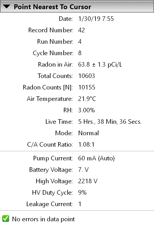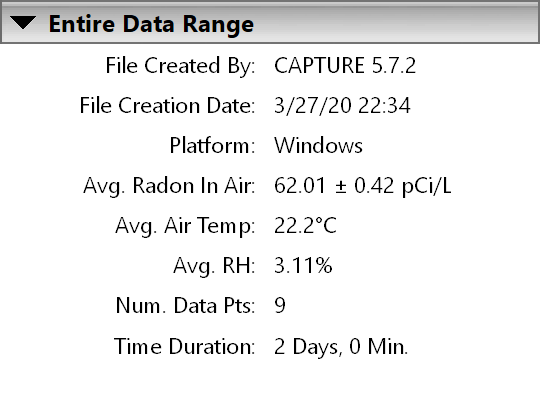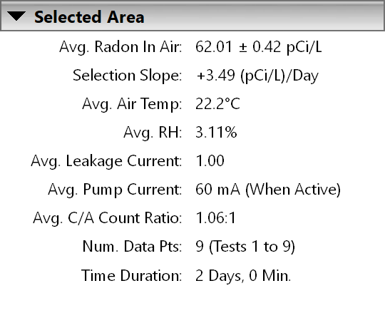 Statistics Panel | The Statistics panel consists of four sub-panels, labeled RAD7, Entire Data Range, Selected Area, and Point Nearest to Cursor. Each of these may be independently expanded or collapsed as viewing area permits. The Statistics panel itself may be resized and scrolled as desired. The contents of each panel are described below. RAD7 Statistics Panel ![]() Figure 7: The RAD7 Statistics Panel The first sub-panel in the Statistics panel shows information about the RAD7 from which the current graph data was obtained. Its heading contains the RAD7's serial number, if it is known. Note that this and other items may be listed as '[Unknown]' because not all RAD7 data files contain supplementary information with details on the device itself. Generally files with the R7CDT file name extension offer this supplementary data, while files with the R7RAW file name extension do not. The exception to this occurs when a R7RAW data file is exported as "Cleaned Up Data"; in this case the resulting R7CDT file contains only what was able to be synthesized from the original R7RAW data. The Sensitivity and Spill Factor values displayed in this panel are generally obtained from the RAD7 data file, but they may also be obtained from an applied RAD7 Profile. If a Sensitivity or Spill Factor value is obtained from a RAD7 Profile and it differs from the value present in the RAD7 data file (or if no such value is present in the RAD7 data, as is the case with .R7RAW files), then the stated value will be marked with an asterisk (*). Entire Data Range Statistics Panel The second sub-panel in the Statistics panel contains information on the application and platform used to obtain the data, and a summary of the entire range of data represented in the graph, including the average radon concentration, thoron concentration (if applicable), temperature, and humidity, as well as the total number of data points and time duration of the data set. ![]() Figure 8: The Entire Data Range Statistics Panel Selected Area Panel The third sub-panel in the Statistics panel displays information on the selected records, i.e. those lying between the two Selection Bars. This includes the selection's average radon concentration, average thoron concentration (if applicable), average temperature, and average humidity, as well as information on the Selection Slope, the number of data points selected, and the time duration of the selected range. Note that the average concentration of the selected data points is also reported along the top of the Graph Window, directly above the graph image. Clicking on this text toggles between displaying the average concentration of the selection and the standard deviation of the selection. The standard deviation indicates the amount of variation between the selected data points. ![]() Figure 9: The Selected Area Statistics Panel Point Nearest To Cursor Panel The fourth sub-panel in the Statistics panel displays statistics on the data record that is closest to the mouse cursor. This includes the record's date, record number, run number, and cycle number, plus radon and thoron concentrations and counts, as well as temperature and relative humidity data. Information on the state of the RAD7 at the time of the test is also provided. If the graph contains raw RAD7 data lacking supplementary information, the Run and Cycle values will not be listed. Any problems with the data point will be reported in the bottom section of the panel. ![]() Figure 10: The Point Nearest to Cursor Statistics Panel |