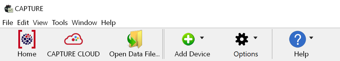 Opening Data in a Graph | The Graph Window appears when data is downloaded from a RAD7, or opened from either the computer's disk or the CAPTURE CLOUD Browser. To open a RAD7 data file from disk, either choose "Open Data File..." from the File menu, or click the Open Data File button on the Main Window toolbar, which is shown in Figure 1, below. To open a RAD7 data from CAPTURE CLOUD, go to the CAPTURE CLOUD Browser and double-click on an item in the list of search results. The Home panel in CAPTURE's Main Window contains an Open Data File button and an Open Recent pop-up menu. A list of recently opened files appears when this button is clicked. This list is also available through the Open Recent command in the File menu. Up to ten recently opened files will be remembered, with the newest items placed at the top of the list. R7RAW or R7CDT data files may also be opened by dragging them onto the CAPTURE icon, or by simply double-clicking them. |