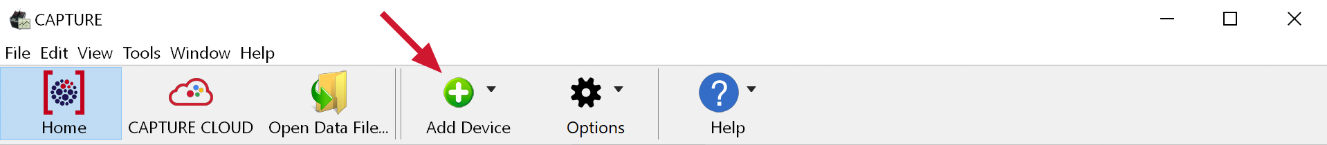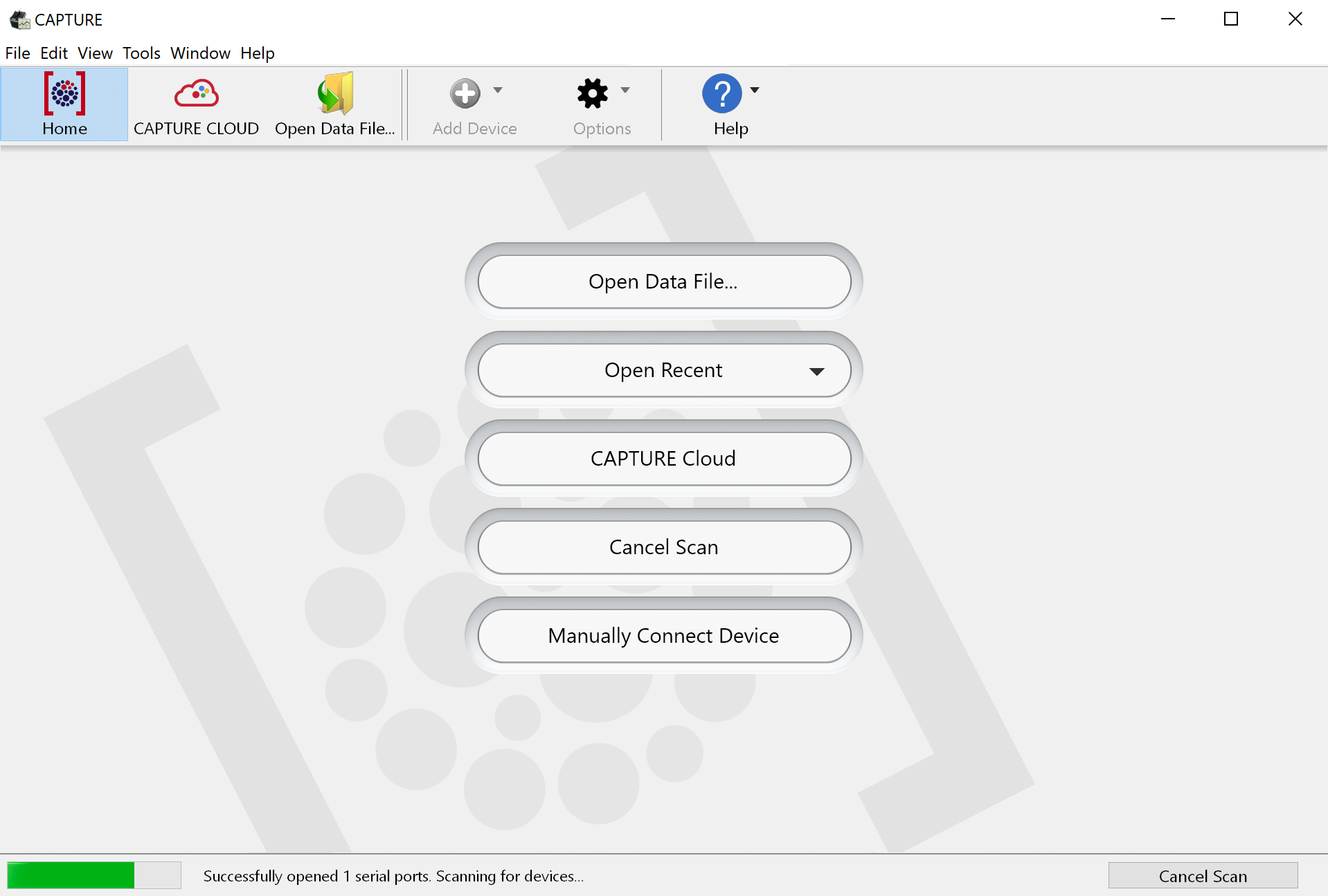 If RADLINK is present on the RAD7 and the instrument is connected to the computer, CAPTURE should detect the RAD7 automatically as the program launches. If it does not, click the Scan For Devices button at the lower right corner of CAPTURE's Main Window. Automatic RAD7 detection can be enabled or disabled in CAPTURE's Preferences Window. The option is enabled by default. When CAPTURE is scanning for RAD7s, a progress bar will appear at the bottom of the Main Window, and any detected RAD7s will be added to the window's toolbar, as shown in Figure 2, above. If RADLINK is not present on the RAD7, click the Add Device button in the toolbar, which is shown in Figure 3, below, and choose Add RAD7 from the menu that appears. The Connection Panel will appear, containing controls for specifying the Connection Type, Serial Port, and Baud Rate, as shown in Figure 4. The Connection Type pop-up menu should be set to "Serial Port". (The "Network" option is for connecting to a RAD7 at a remote location. This may require some additional configuration, as discussed in the Long Distance RAD7 Communication section.) The Serial Port pop-up menu should be set to the name of the serial port to which the RAD7 is connected. Finally, the Baud Rate pop-up menu should be set to the baud rate of the RAD7, which is typically 9600. For a RAD7 without RADLINK, the baud rate will always be 1200. After specifying these settings, click the Connect button. |