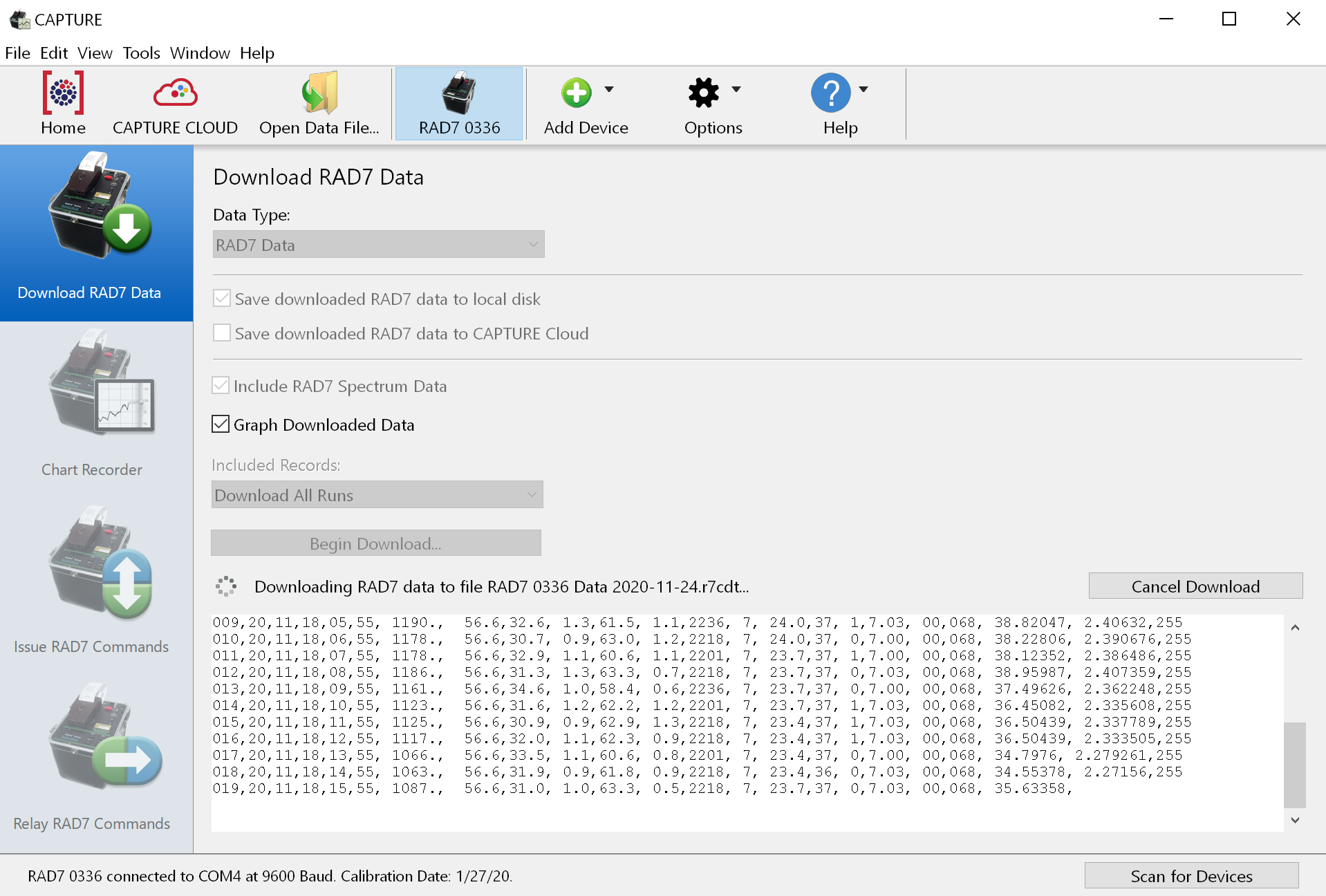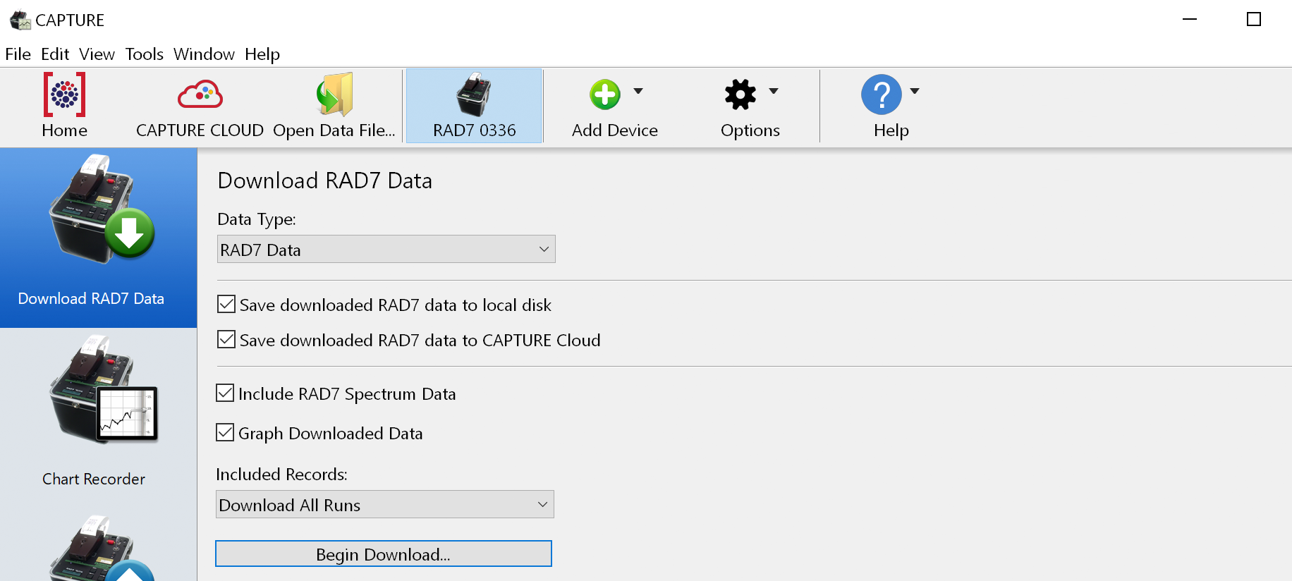 CAPTURE makes it easy to quickly download all of the data from each connected RAD7. Once the RAD7s have been discovered, the Download Data From All RAD7s command will become enabled in the Options menu located on the Main Window toolbar. |