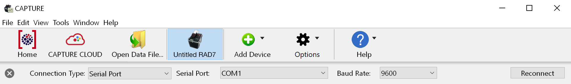 When CAPTURE starts up, the Main Window will appear. This window contains controls used for downloading RAD7 data and performing other RAD7 communication operations, as well as opening existing RAD7 data files