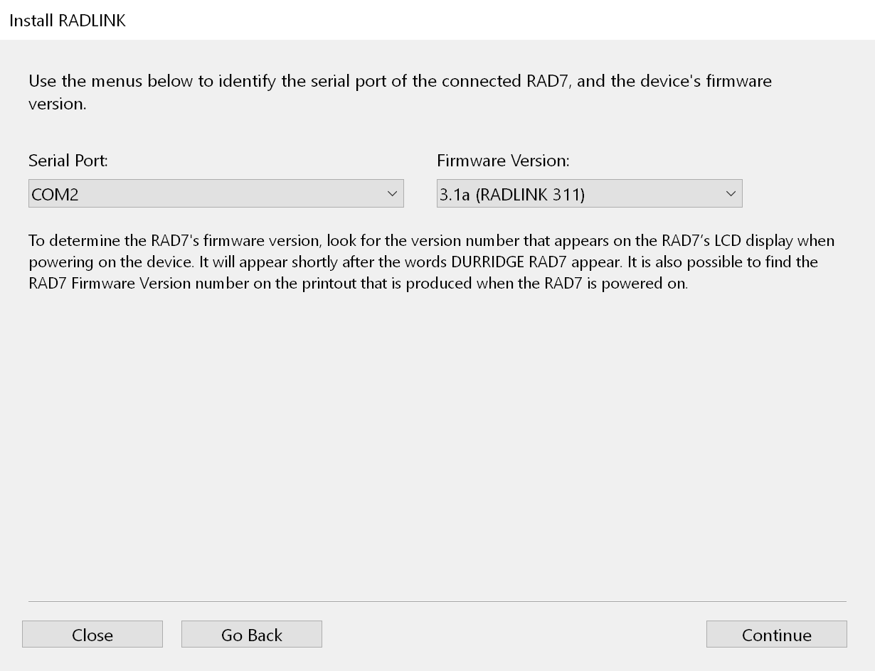 ![]() Figure 9: RADLINK Installation Serial Port and Firmware Version setup |
