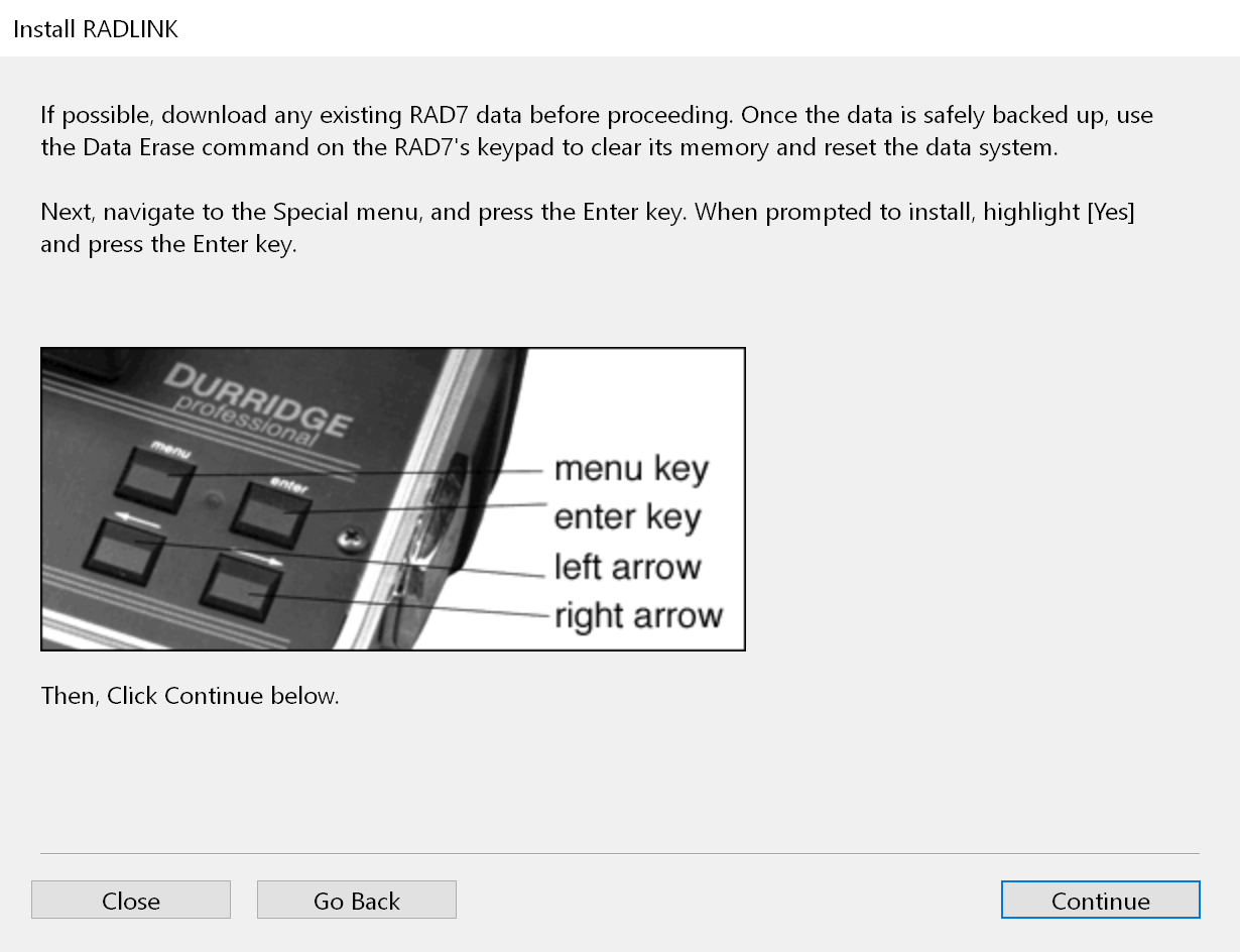After clicking Continue, a set of instructions will appear as shown in Figure 10, below. These instructions will remind the user to download any existing radon test data from the RAD7 before proceeding, in order to protect against unintentional data loss when installing or disabling RADLINK. If RADLINK is being installed, use the device's keypad to navigate to the Special menu, and press the Enter key. You will be prompted to install RADLINK. Highlight [Yes] and press the RAD7's Enter key again. If RADLINK is being disabled, navigate to the Special menu, press Enter, and press the right arrow button several times to select S-Load. Then press Enter again. The RAD7 will begin to await incoming RADLINK data. |