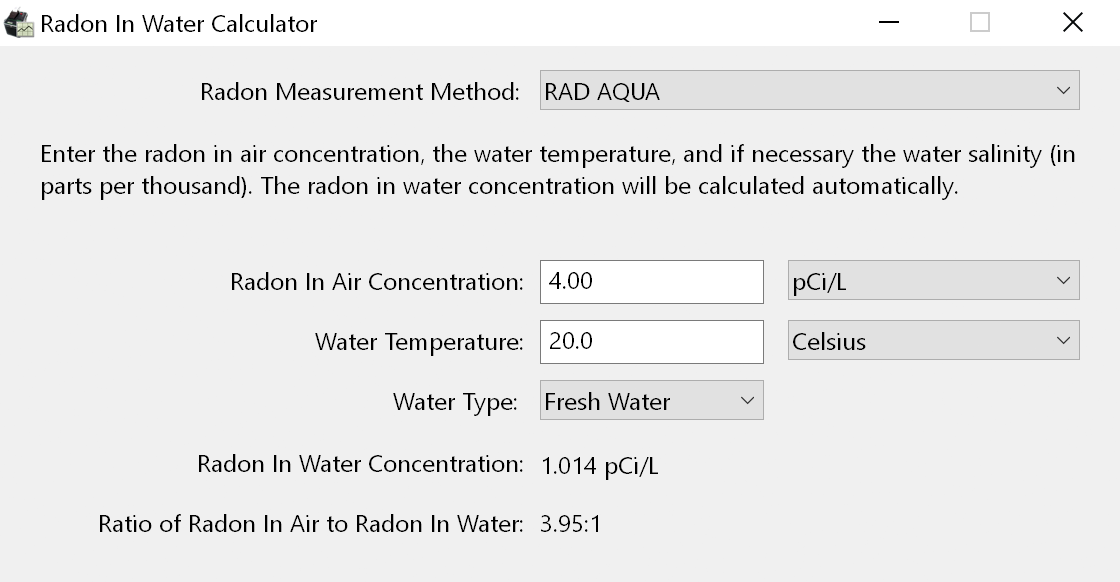 ![]() Figure 3: RAD H2O Radon In Water Calculator Window |