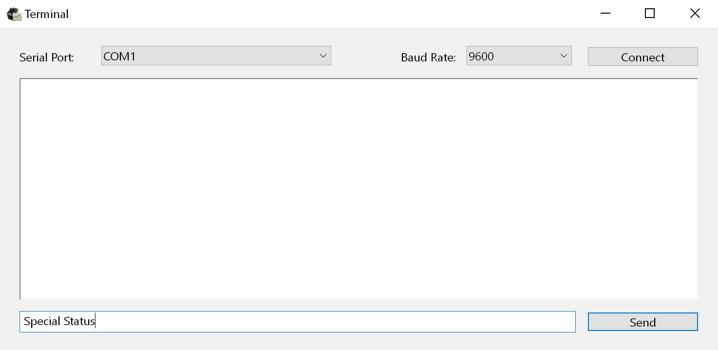 The Terminal Window command in the Tools menu provides an interface for manually issuing serial commands to any device that communicates using a standard serial protocol, including RAD7s and DRYSTIKs. The Terminal Window is shown in Figure 12, below. Use the Serial Port and Baud Rate pop-up menus to specify terminal connection settings, and then click Connect to begin. Enter a command using the command line at the bottom of the Terminal Window, and then click the Send button to issue the command. When a response is received it will be added to the large text area at the center of the window. When communicating with a RAD7 or other device via the Terminal Window, other CAPTURE features that involve device communication, such as the Chart Recorder, will be temporarily unavailable. |