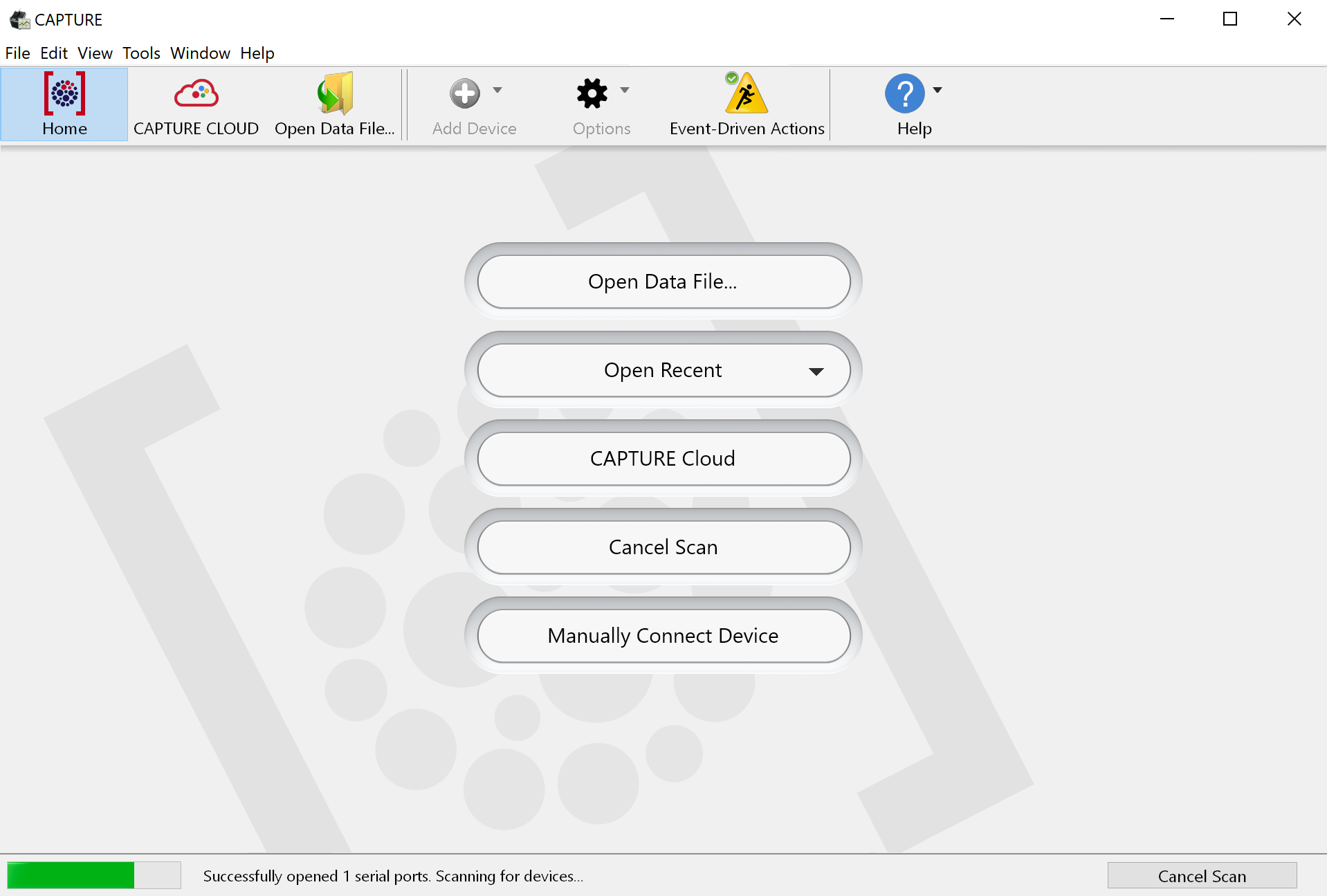 When Capture starts up, the Main Window will appear. This window contains controls used for downloading radon data from the RAD8 and RAD7, opening existing radon data files from disk, and performing communication operations. When the Main Window first appears, some controls will be disabled. These controls become active only when a connected instrument has been detected. |