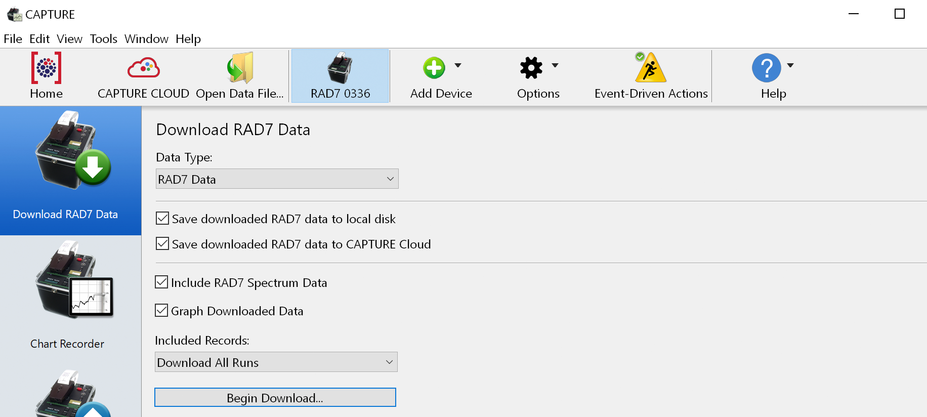 Capture makes it easy to quickly download all of the data from each connected RAD7. Once the RAD7s have been discovered, the Download Data From All RAD7s command will become enabled in the Options menu located on the Main Window toolbar. |
