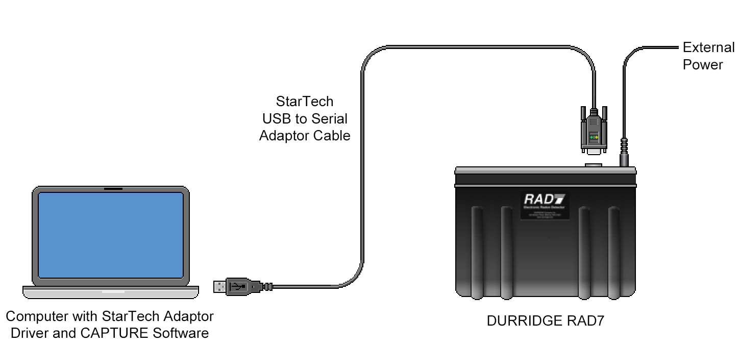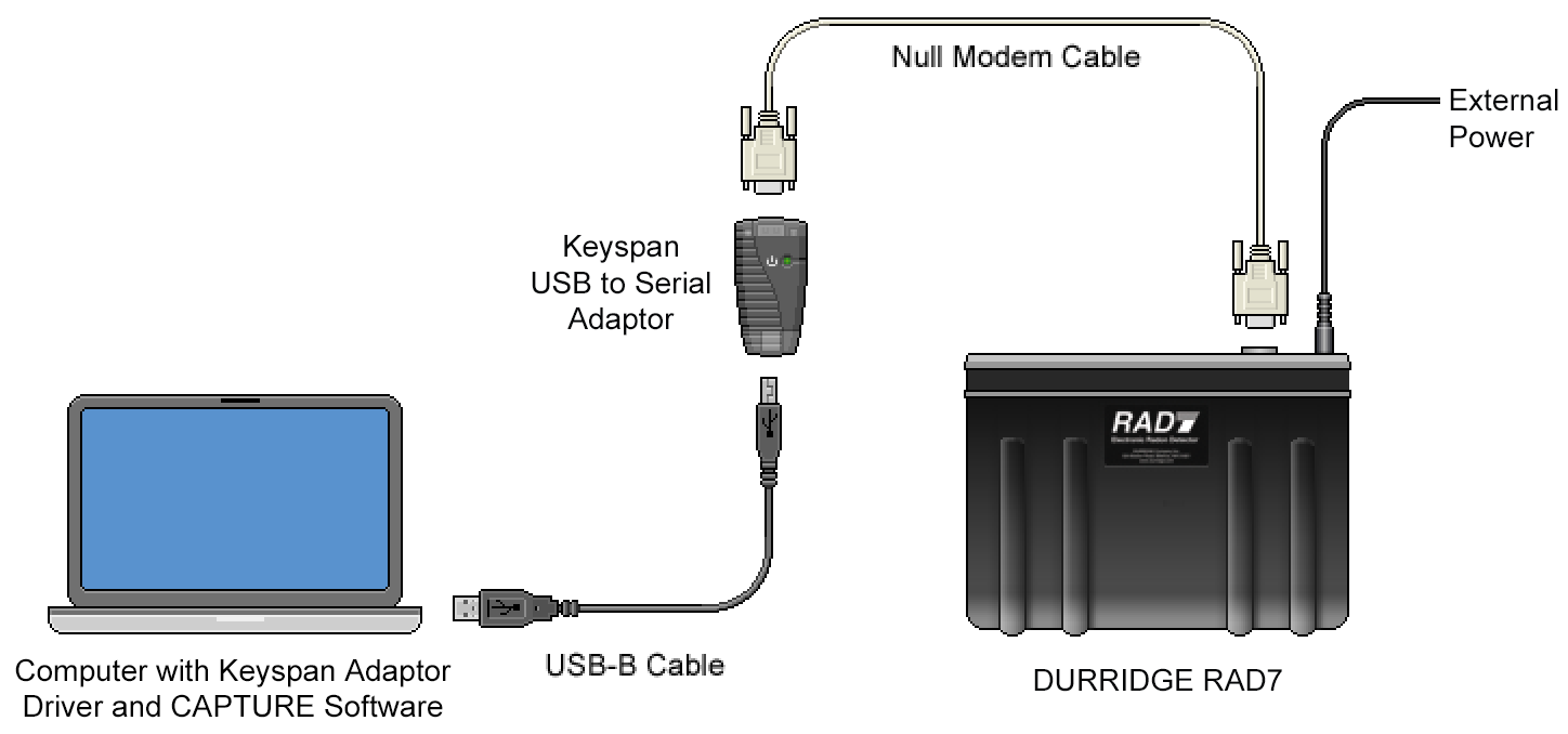 Make sure the RAD8 or RAD7 contains valid tests, and that it is plugged into a stable power source and powered On. If using a RAD8, the included USB-A to Mini-B cable should be used to connect the RAD8 to the compter. If using a RAD7, the included USB to Serial adapter should be connect the instrument to the computer. It may be necessary to install USB to Serial adaptor driver software on your computer. Drivers are available at the Software Drivers page at the Durridge website. If the computer has a physical serial port, it is possible to instead use an RS232 DB9 female to female null modem cable to connect the RAD7 directly to the computer's serial port. For wireless RAD7 connectivity, a Bluetooth Serial adapter may be used to facilitate communication, as explained in the Long Distance Connectivity section. Durridge offers preconfigured Parani SD-1000 Serial to Bluetooth Adapters as an optional RAD7 accessory. Figure 1 shows how to connect the RAD8 to a computer using the USB-A to Mini-B Cable. Figures 2 and 3 show how to connect the RAD7 to a computer using two different kinds of USB to Serial adapters: the StarTech adapter (Figure 2), and the Keyspan adapter (Figure 3). |