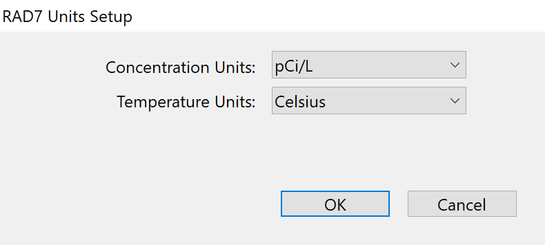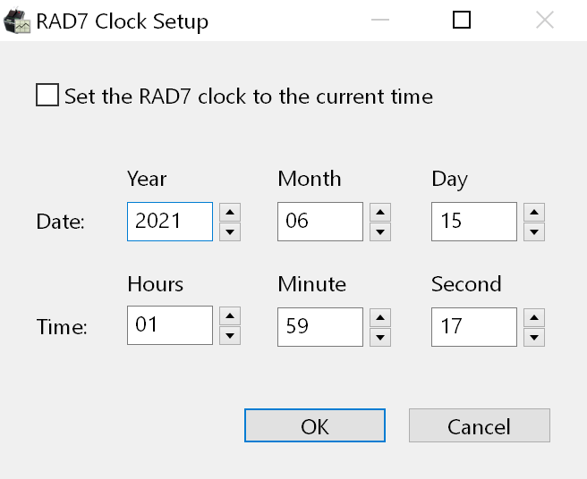The Start RAD7 Test button begins a RAD7 test and initiates real time data tracking. This button has the same effect as selecting Test Start on the actual RAD7. Likewise, the Stop RAD7 Test button emulates the RAD7's Test Stop function. The Test, Data, and Setup menus provide access to the set of commands available on corresponding menus on the RAD7 itself. Selecting one of these commands will have the same result as entering the equivalent command on the physical RAD7. These commands are described in Chapter 2 of the RAD7 User's Manual. Note that menu commands ending with ellipses (...), such as "Units..." and "Clock..." will present dialog boxes for specifying command parameters, as shown in the Figures 3 and 4, below. The Refresh Status Display button will update the statistics shown in the Chart Status Display, and will cause the Chart Recorder image to be refreshed. Normally this occurs automatically at regular intervals, but the Refresh Status Display button is useful when an immediate status update is desired. The Chart Configuration menu contains two commands: Logging Settings and Chart Parameters. The Logging Settings command is used to configure the program to log Chart Recorder data to disk as it arrives. This is explained in the Logging Chart Data section, below. The Chart Parameters command brings up the Chart Parameters Window, which is used to specify the Radon Measurement Method, which may be either Radon in Air, RAD AQUA, or Water Probe. If the RAD AQUA or Water Probe is selected, the Chart Recorder will be able to display radon-in-water data. Computing radon-in-water concentrations requires information about the water's temperature and salinity. The temperature can be set to either the air temperature as recorded by the RAD8 or RAD7 (plus or minus a fixed offset), or to a fixed temperature value, expressed in either Fahrenheit or Celsius. The salinity is expressed in parts per thousand (‰) The Chart Parameters Window is shown in Figure 5, below. |