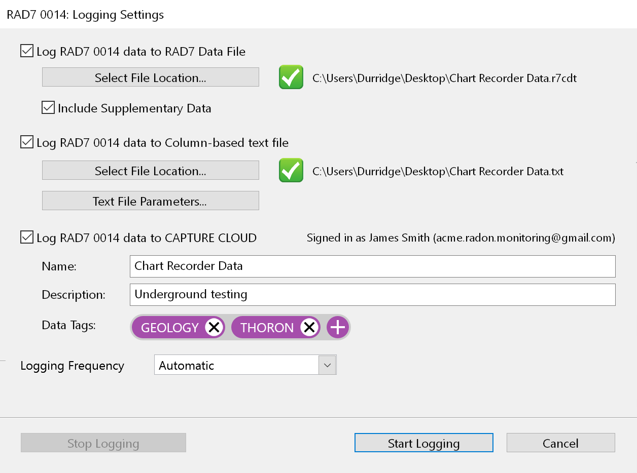 Logging Chart Data | When the Chart Recorder is active, chart data may be logged to disk in any of several formats. Clicking the Settings button, which is accompanied by a logging indicator light to the left of the chart, brings up the Logging Settings Window, which is shown below. The Logging Settings Window contains checkboxes for specifying whether to log Chart Recorder data to a radon data file, a column-based text file, and/or Capture Cloud. When logging to a radon data file or a column-based text file, it is necessary to specify a location for the file on disk. When logging to Capture Cloud, it is necessary to specify a name for the data set that will be stored in the Cloud. Specifying a description is optional, but recommended. The Logging Frequency pop-up menu is used to control how often the data is logged. The default setting of Automatic causes data to be logged whenever the RAD8 or RAD7 records a new cycle. After specifying the desired settings, click the Start Logging button. The Logging light on the Chart Recorder will turn green to indicate that logging is active. Logged data will be updated whenever the RAD8 or RAD7 records a new data point. It is possible to return to the Logging Settings dialog at any time by clicking the Settings button. If logging is active, it may be disabled with the Stop Logging button, found at the lower left corner of the Logging Settings dialog. Note that even if logging is not specifically enabled, Capture will maintain records of raw Chart Recorder data in a user library folder. These files can be revealed at any time by selecting Show Chart Recorder Logs from the File Menu. |