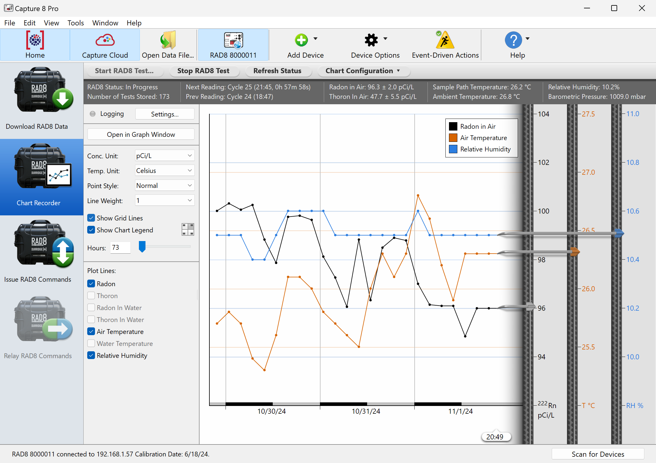 The Capture Chart Recorder displays a real-time graph of RAD8 or RAD7 data as it is recorded. As a radon test progresses, a set of virtual pens plot radon concentration, temperature, and humidity data. The chart slowly scrolls to the left in real time, so that the right edge of the chart represents the current time. The Chart Recorder contains a button bar for starting and stopping tests and configuring instrument settings. Below the Button Bar is a Status Display panel which indicates the current state of the selected RAD8 or RAD7. A nearby panel of Chart Recorder Controls is used to adjust the appearance and range of the Chart Recorder. These features and others are described in detail below. |