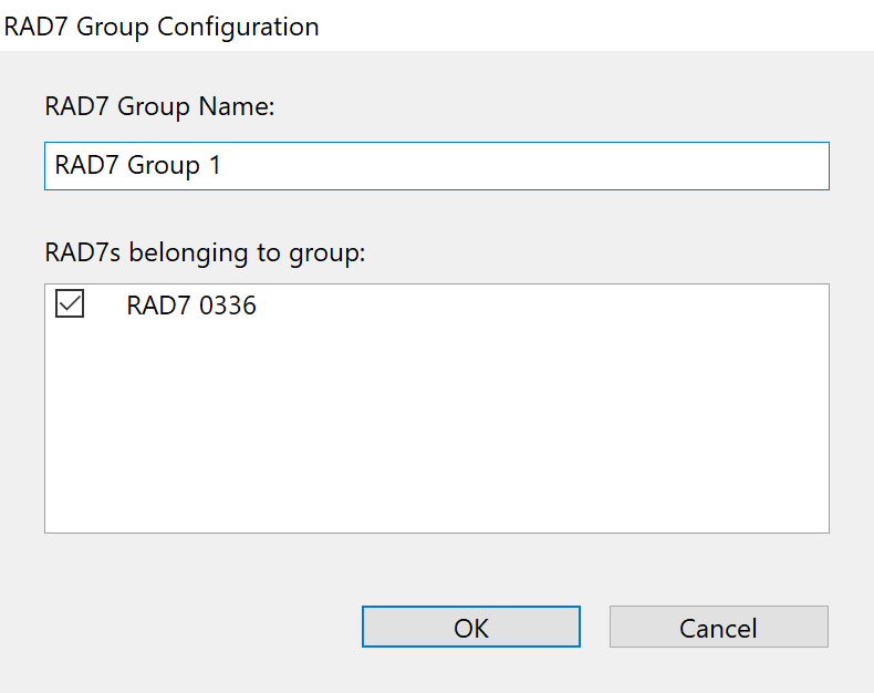 Monitoring Device Groups | The Chart Recorder is particularly useful for monitoring groups of RAD8s or RAD7s. Device Groups are user-specified sets of instruments whose data is averaged and displayed as a single chart. For best results the timing of the devices in the group should be synchronized. To configure a RAD8 Group or RAD7 Group, first make sure at least two RAD8s or RAD7s are connected and their icons are visible in the Main Window Toolbar. In the toolbar, select the Options Menu (which is labeled with a gear icon) and select Add RAD7 Group... or Add RAD8 Group... The Group Configuration Window will appear, as shown below. This window is used to specify the Group's name and its member devices. After the Group has been configured, it will appear as an icon in the Toolbar, next to the other devices. A numeral on the icon will indicate how many instruments belong to the group. Selecting a Device Group causes displays a chart representing an average of the data belonging to the member devices. ![]() Figure 8: The Device Group Configuration Window Details on adding, managing, and removing RAD8 Groups and RAD7 Groups are provided in the Toolbar Commands section. |