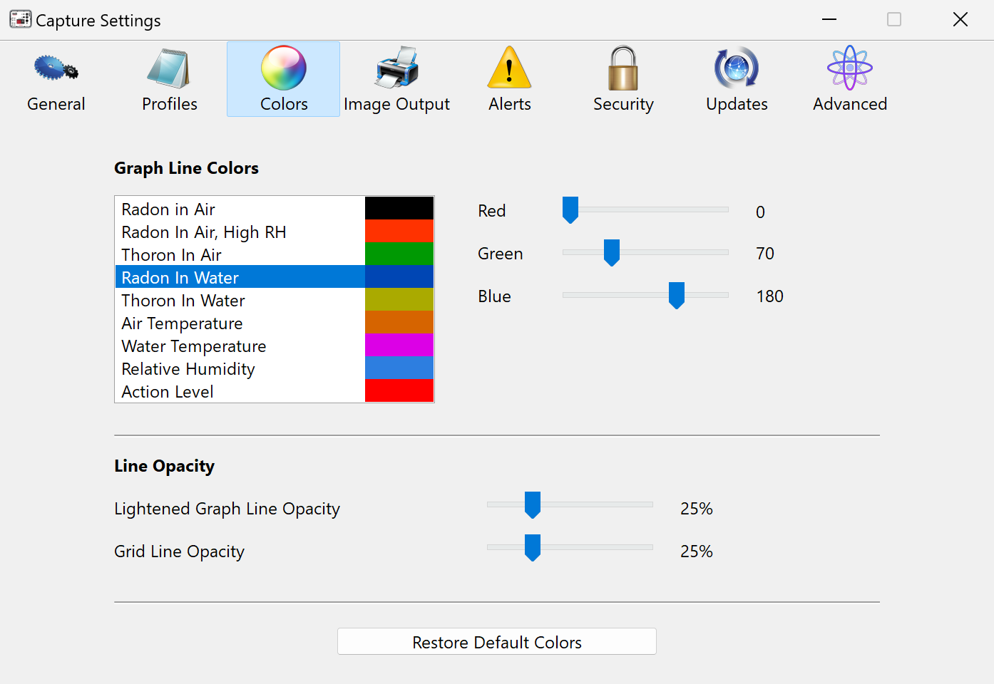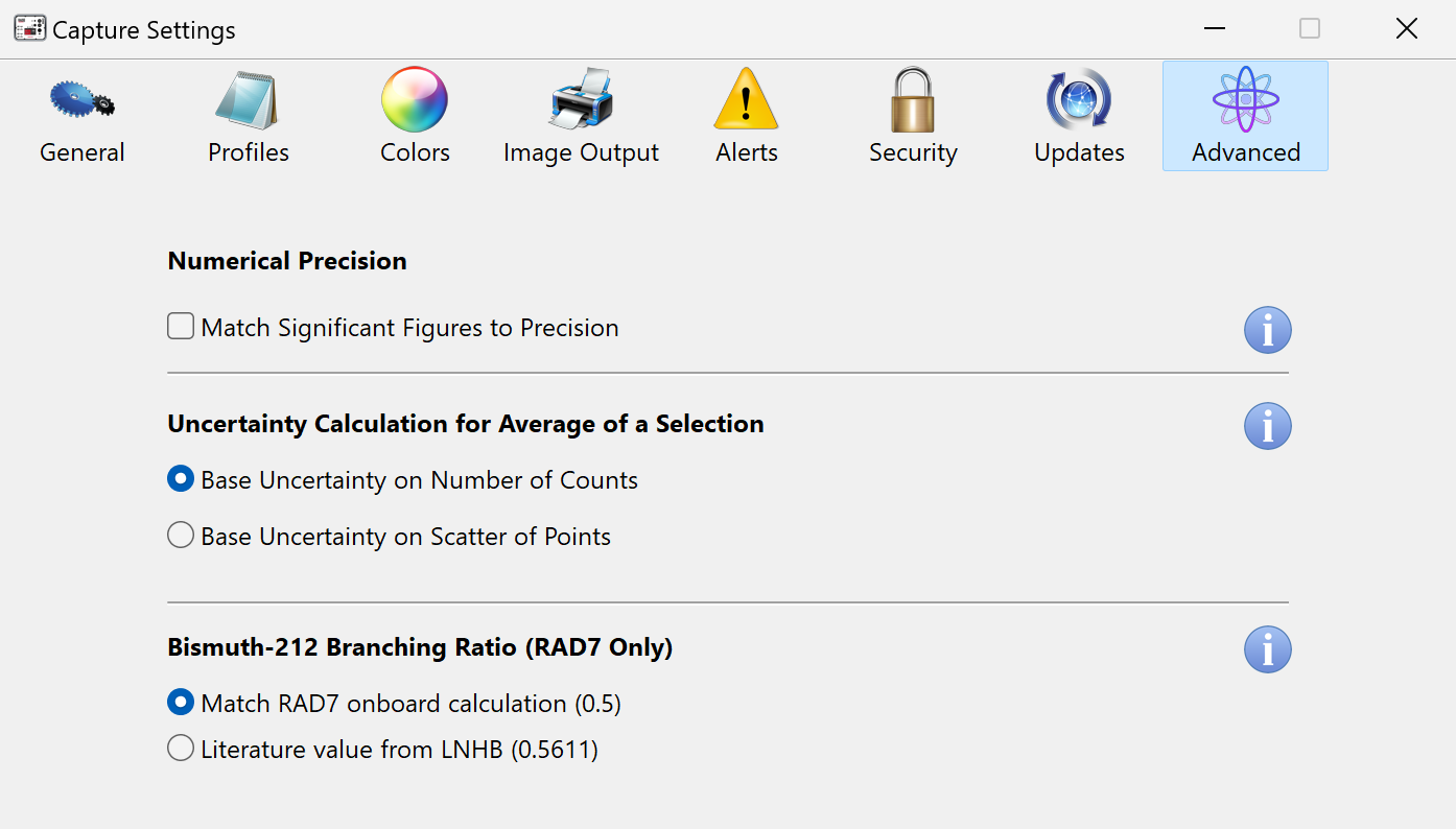 The first set of controls to the right of the RAD7 Profiles list box lets you specify the name of a User Created RAD7 Profile, and (optionally) an Effective Date and RAD7 Serial number. If the latter properties are specified, Capture will automatically select the profile when a data file with matching properties is opened. However User Created Profiles are generally assigned manually, using the controls in upper left corner of the Graph Window. Radon Settings The Radon Settings controls are used to configure a User-Created RAD7 Profile's NORMAL and SNIFF Sensitivity settings. The Sensitivity Source pop-up menu is used to specify whether the NORMAL and SNIFF Sensitivities are obtained automatically, versus being manually specified by the user. If the first option is selected, the NORMAL and SNIFF Sensitivities are determined by analyzing data obtained from the RAD7 (provided the latest version of RADLINK is present on the instrument). If the second option is chosen, the sensitivity values must be entered by the user. Thoron Settings The Thoron Settings controls are used to configure a User Created RAD7 Profile's THORON Sensitivity settings. The Sensitivity Source pop-up menu is used to specify how the THORON Sensitivity is obtained. Capture is usually able to obtain a RAD7's THORON Sensitivity automatically, in the same manner with which it obtains the instrument's NORMAL and SNIFF sensitivities. If the RAD7 has been specifically calibrated for Thoron, Capture will likewise detect the calibrated THORON sensitivity and apply it to the corresponding Calibration Generated Profile, but it may nevertheless be advantageous to establish a User Created Profile for the thoron-calibrated RAD7, not only to affirm the calibrated THORON Sensitivity (which is stated on the signed Thoron Calibration Certification Report provided by Durridge), but also to accommodate the calibrated BA Spill Factor, which is calculated only during the thoron calibration procedure. The BA Spill Factor is explained below. Spill Factor Settings A RAD7's BA Spill Factor represents the degree to which radon readings must be corrected in the presence of high thoron. This value should be manually entered in the BA Spill Factor field. It can be obtained from the Thoron Calibration Certification Report provided by Durridge after a RAD7 has been specifically calibrated for thoron. If a specific thoron calibration has not been conducted, use the default value of 0.0250. A RAD7's CB Spill Factor represents the degree to which thoron readings must be corrected in the presence of high radon. The CB Spill Factor Source pop-up menu is used to specify whether the CB Spill Factor is obtained automatically, versus being manually specified by the user. It may be obtained automatically from the RAD7 if the instrument contains the latest version of RADLINK. Otherwise, it should be entered manually. The CB Spill Factor value can be obtained from the signed RAD7 Calibration Certificate provided by Durridge. |
