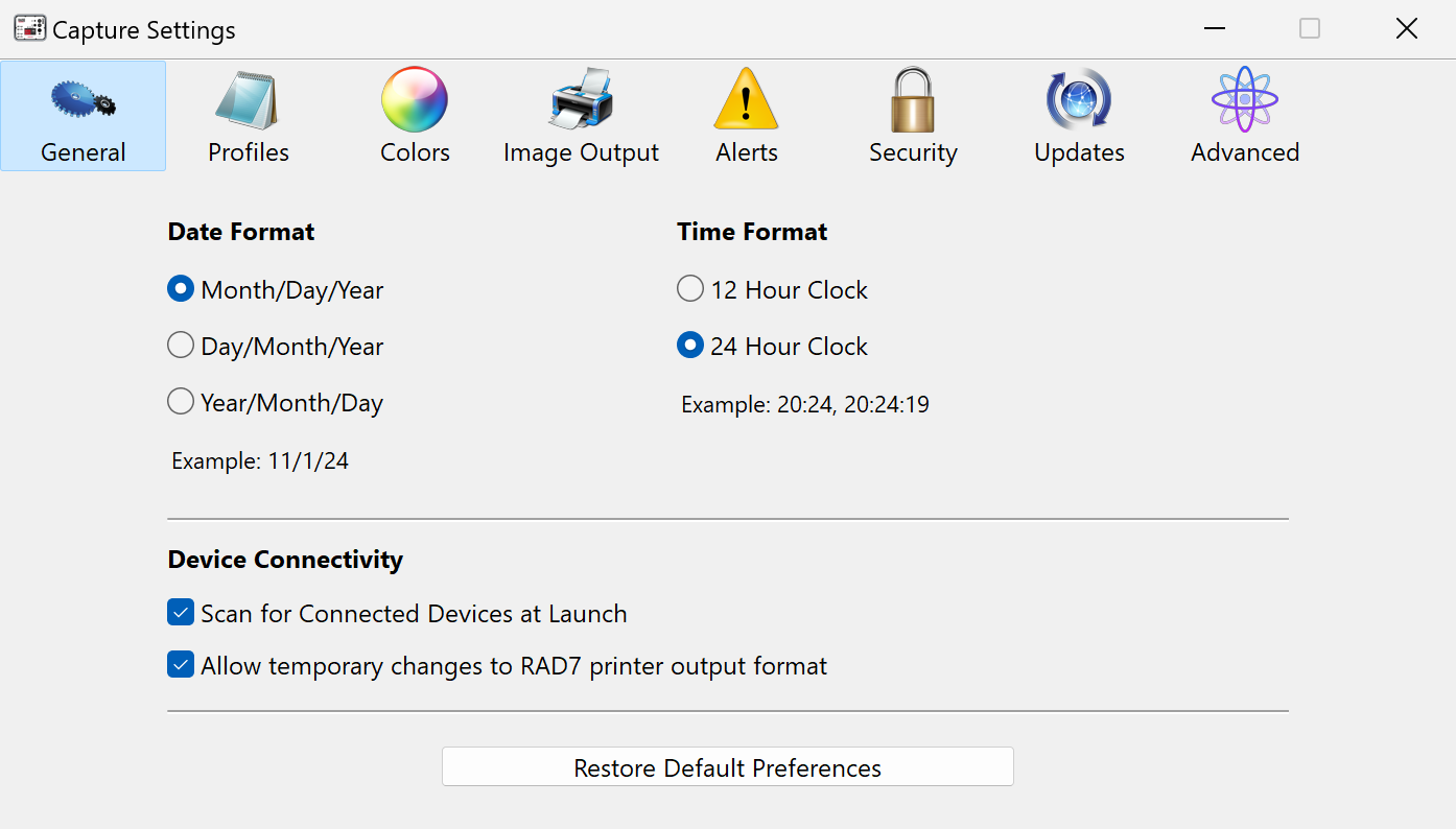 Check For Updates Checkbox Determines whether Capture will automatically check for updates at scheduled intervals. When an update becomes available, a button labeled Update Available will appear in the lower right corner of the Main Window. Clicking this button initiates the updating process. |