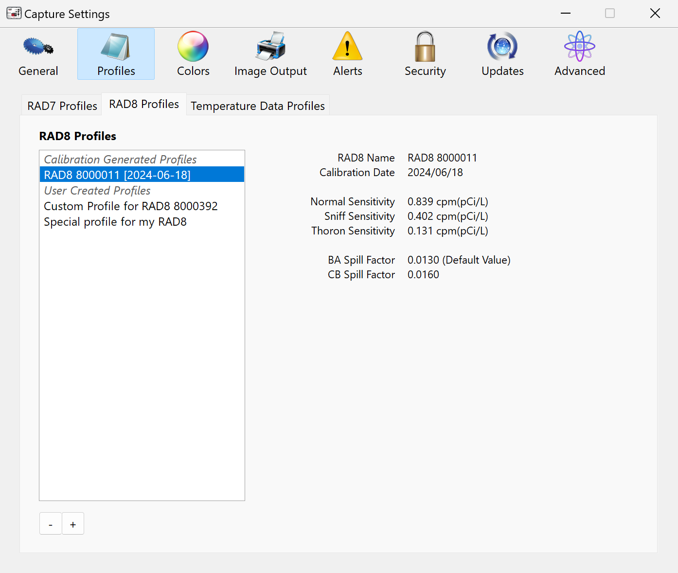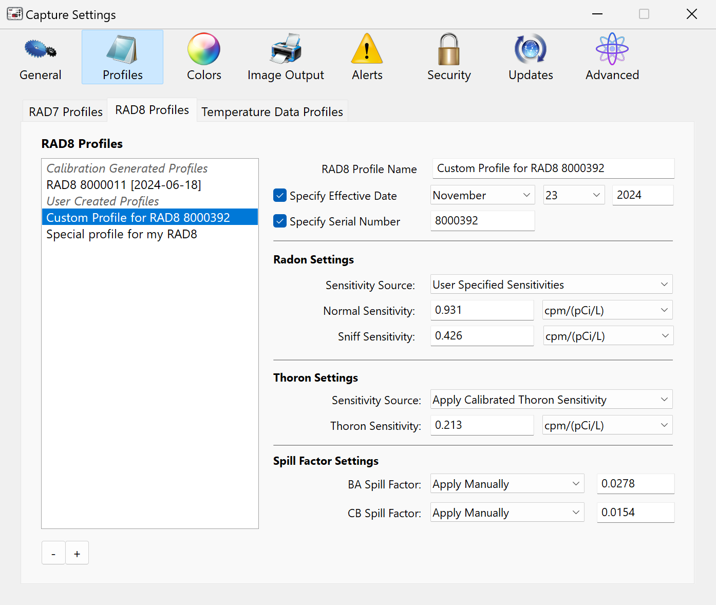 When a Calibration Generated RAD7 or RAD8 Profile is selected, its three Sensitivity values appear in the panel to the right, along with its CB and BA Spill Factors values. These values are obtained automatically from the instrument. In the case of the RAD7, the BA Spill Factor is always presumed to be 0.0250. If the RAD7 undergoes a specific calibration for thoron sensitivity, the instrument's BA Spill Factor will be known with greater certainty, and if it differs from 0.0250, a User Created RAD7 Profile should be added, and this known BA Spill Factor value should be assigend to the Profile. Note that the automatic retrieveal of a RAD7's Sensitivity and Spill Factor values requires that RADLINK is installed on the instrument. When a User Created RAD7 Profile is selected, an full set of configuration controls appears. These controls fall into several categories, as described below. |