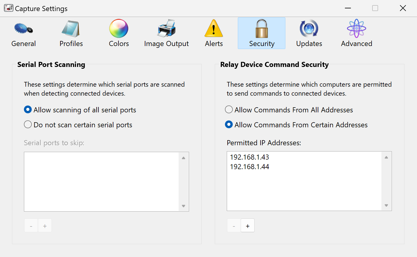 Serial Port Scanning The Serial Port Scanning controls are used to omit specified serial ports from the scanning process which is used to detect connected devices. This is useful if a particular serial port should be reserved for another application, or if the process of opening a particular port causes delays while launching Capture. If the Allow scanning of all serial ports radio button is selected, each serial port on the computer will be scanned when searching for connected devices. If the Do not scan certain serial ports radio button is selected, then the serial ports that have been entered into the Serial ports to skip list will be be omitted from the scanning process. Use the Plus (+) and Minus (-) buttons to add and remove serial ports to and from the list. |
