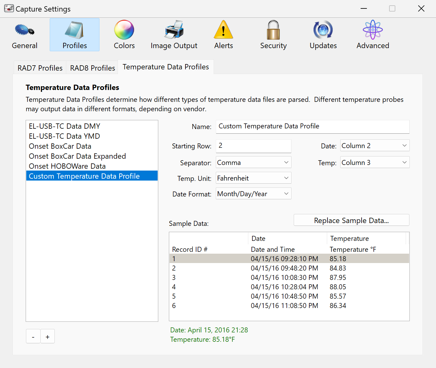 When a RAD AQUA, Water Probe, or Big Bottle System is used to collect radon data from an underwater source, Capture accounts for the water temperature in order to calculate the exact radon in water concentration. The necessary calculations are performed automatically, but usually it is necessary to provide Capture with a Temperature Data File consisting of water temperature records obtained using a temperature logging device. The RAD7 itself is not equipped to record water temperatures. A temperature logging device with a serial or USB interface should be used to record water temperature values at appropriate intervals. After the temperature data has been recorded to the logger, the data must be transferred to the computer. Capture has built-in support for the EL-USB-TC temperature logger manufactured by Lascar Electronics. Software for obtaining temperature data from other loggers is available from the device manufacturer. Capture can only interpret temperature data properly if it is given a complete definition of the format in which the data is stored. The Settings Window's Temperature Data Profiles tab provides controls for specifying these formats. |