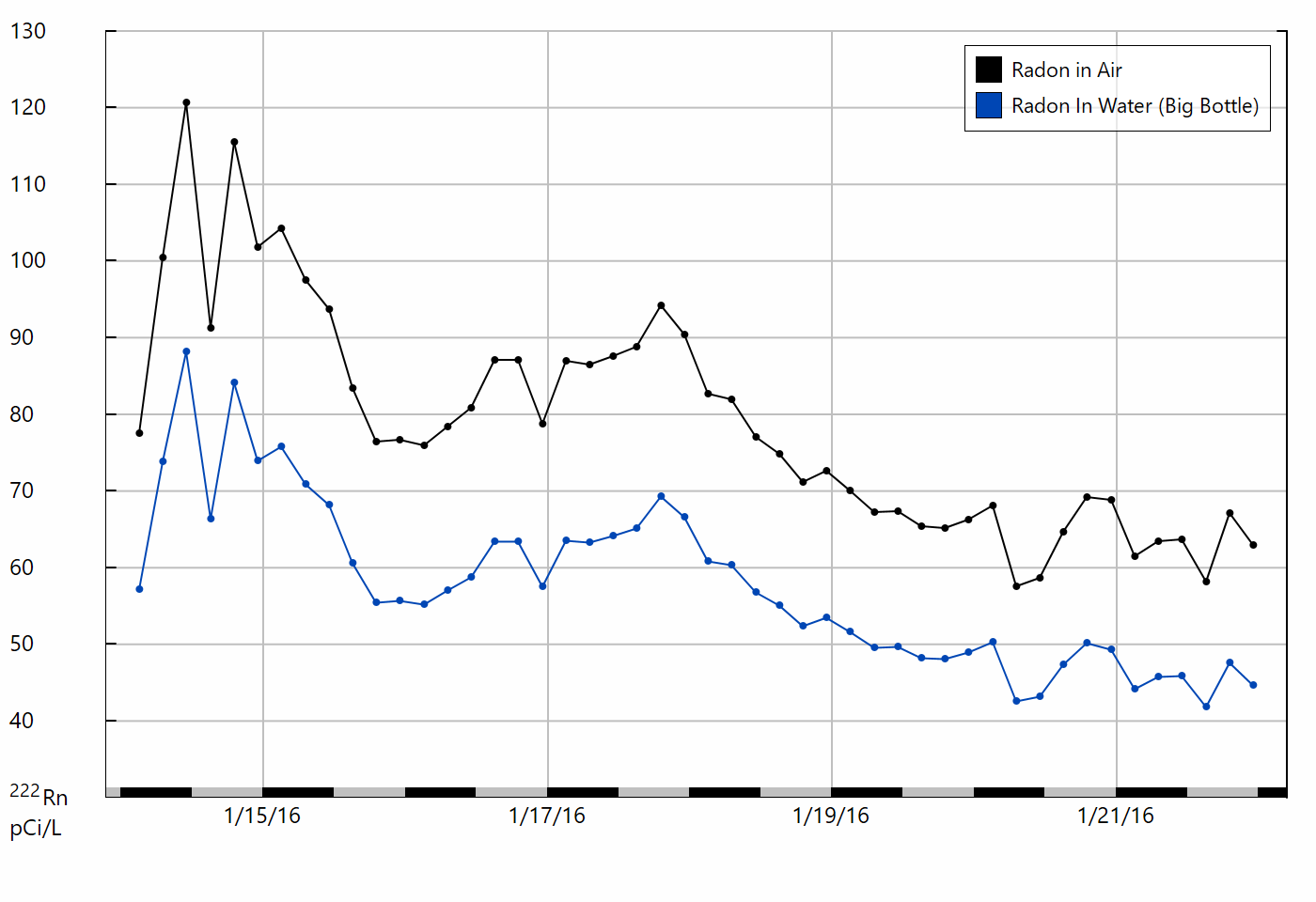 The Preset Configurations pop-up menu at the bottom of the window can be used to select from several typical configurations, involving a variety of common bottle sizes and aerator types. Choosing a preset configuration causes several fields to be automatically populated with the appropriate values. Note that Capture does not allow the user to specify a configuration in which the Drying Unit, DRYSTIK, and Bubble Trap are absent and the aerator cap is of an insufficient volume, because experiments involving such a setup would present a high risk of water entering the RAD8 or RAD7. After the appropriate settings have been entered, click the OK button. The graph window will then permit the display of Radon in Water and Water Temperature graph lines, which are unavailable in conventional graphs. The graph should indicate a radon-in-water concentration somewhat different than the Radon In Air concentration, as shown in Figure 8. Because of thoron's very brief half life, it is not possible to graph Thoron in Water concentrations obtained using the Big Bottle System. See the Big Bottle System manual for detailed information on interpreting this data, and the Graph Window Navigation section for more information on Capture's graphing features. |