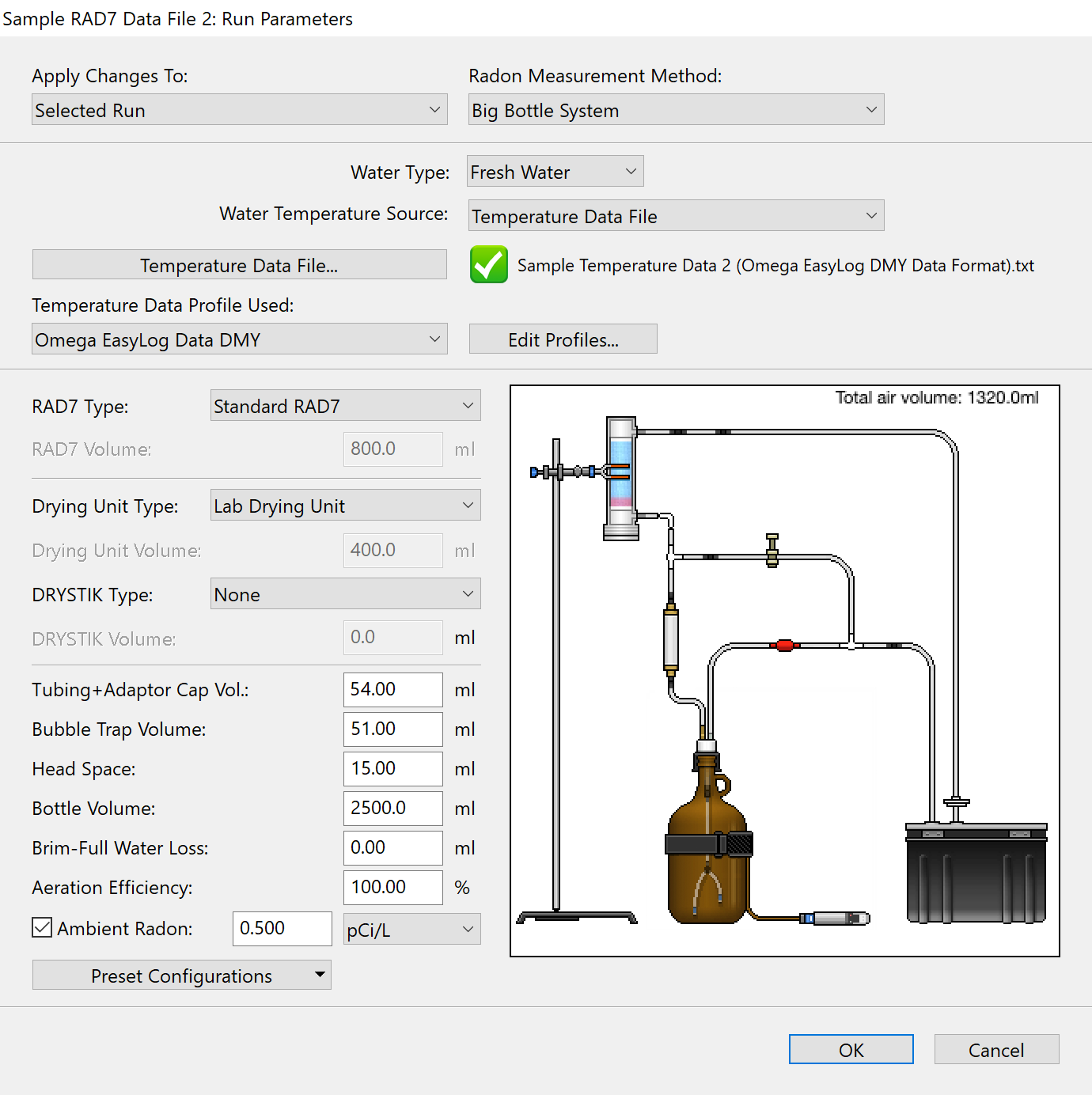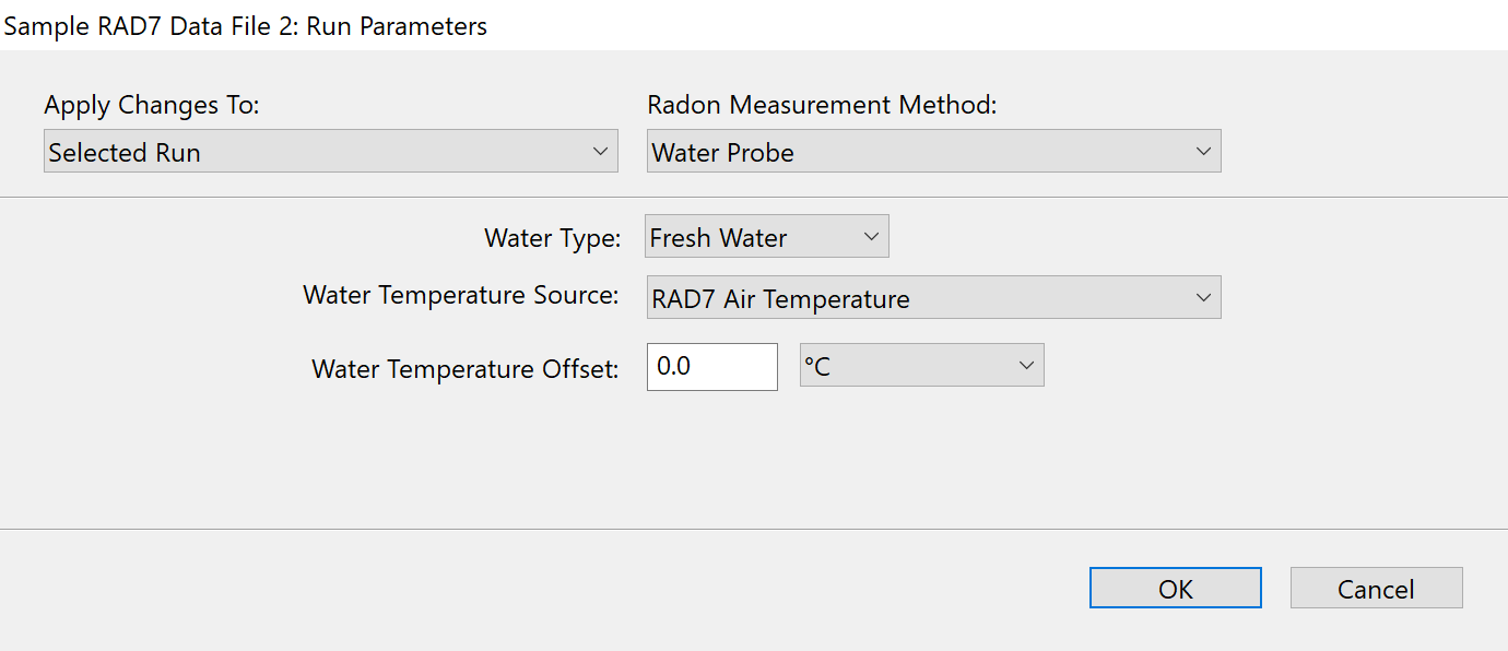 ![]() Figure 4: The RAD7 Run Parameters Window with the Radon Measurement Method set to a radon-in-water accessory that requires a water temperature source. The Water Temperature Source has been set to the Air Temperature. |