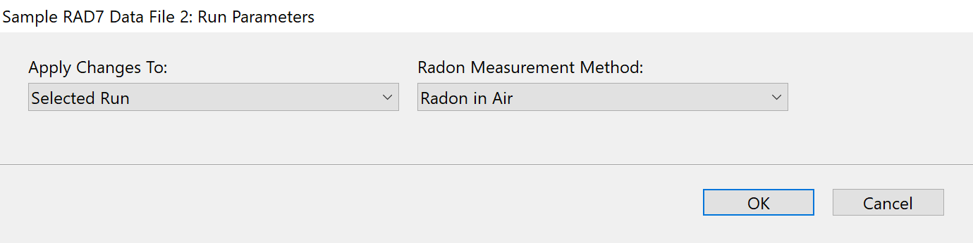 ![]() Figure 1: The RAD7 Run Parameters Window, used for specifying the Radon Measurement Method. |