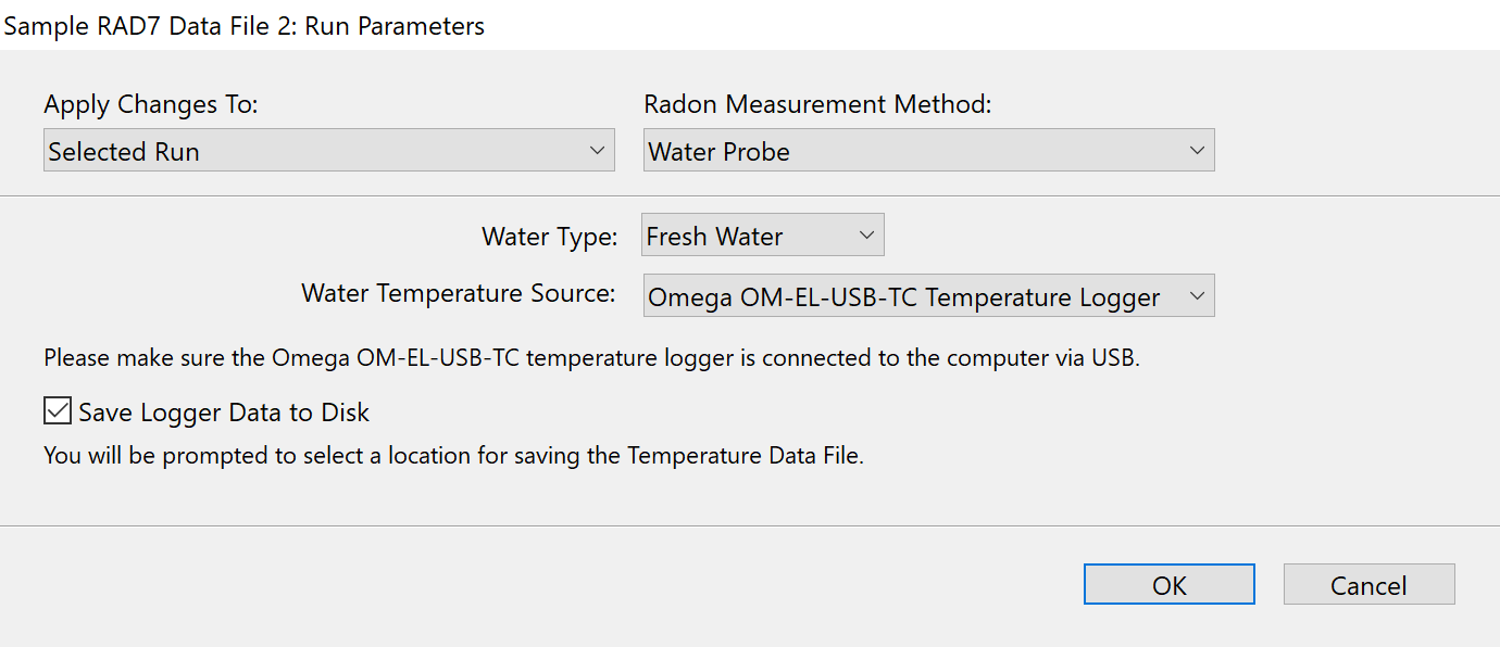 ![]() Figure 6: The RAD7 Run Parameters Window with the Radon Measurement Method set to a radon-in-water accessory that requires a water temperature source. The Water Temperature Source has been set to the EL-USB-TC Temperature Logger. |