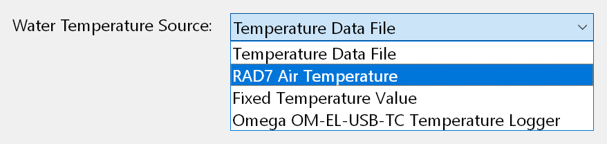 If the Water Temperature Source pop-up menu is set to Air Temperature, the only further action required is to specify the Water Temperature Offset, as shown in Figure 4. The specified number of degrees (Fahrenheit or Celsius) will be added to the air temperature recorded by the RAD8 or RAD7 to determine the presumed water temperature. Typically a small negative number will be used. |
