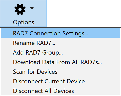 Open File Button The Open File button brings up the Open Dialog, in which a RAD7 Data File may be opened in a Graph Window. Device Selection Buttons Each connected RAD8, RAD7, and DRYSTIK is represented as a toolbar button, labeled with a serial number or custom device name. The content of the Main Window pertains to whichever device is currently selected in the toolbar. Add Device Button The Add Device button manually adds a new RAD8, RAD7, or DRYSTIK. It is necessary to add a device manually when it is being reached via a local network. Additionally, a RAD7 must be added manually if it does not have RADLINK installed and can not be discovered automatically. When a device is added manually, the Connection Settings panel appears. This panel is described in detail in the Connecting to the Instrument section. Options Menu ![]() Figure 1: The Options Menu in the Main Window toolbar. The Options Menu is labeled with a gear icon and consists of several commands: RAD8/RAD7/DRYSTIK Connection Settings The RAD8/RAD7/DRYSTIK Connection Settings command brings up the Connection Settings panel, which can be used to specify how the computer connects to the selected device. It is also used when connecting to a RAD7 or DRYSTIK via a local network. The Connection Settings panel is described in more detail in the Connecting to the Instrument section Rename RAD8/RAD7/DRYSTIK... The Rename RAD8/RAD7/DRYSTIK command brings up a dialog box in which a new name for the selected device may be entered. The specified name appears under the device's icon in the toolbar. If no name is specified, the RAD7 or DRYSTIK is referred to by its serial number. Add RAD7 Group... The Add RAD7 Group command creates a new RAD7 Group for the Chart Recorder and displays the RAD7 Group Configuration dialog, which which is used to specify the group's name and its member RAD7s. More information is available in the Monitoring Device Groups section. Add RAD8 Group... The Add RAD8 Group command creates a new RAD8 Group for the Chart Recorder and displays the RAD8 Group Configuration dialog, which which is used to specify the group's name and its member RAD8s. More information is available in the Monitoring Device Groups section. Download Data From All RAD7s The Download Data From All RAD7s command makes it possible to quickly obtain all of the raw data from each connected RAD7. This process is described in the Downloading From All RAD7s section. (Re)scan for RAD7s The Rescan for RAD7s command detects all of the RAD7s that are attached to the computer and adds them to the Capture toolbar. Any RAD7s that were detected previously are removed, then rediscovered. The Rescan for RAD7s button at the lower right corner of the Main Window performs the same function as this menu command. Disconnect Current RAD8/RAD7/DRYSTIK (or Remove Current RAD8/RAD7 Group) The Disconnect Current RAD8/RAD7/DRYSTIK (or Remove Current RAD8/RAD7 Group) command disconnects only the currently selected RAD7, DRYSTIK, or RAD7 Group. It may later be restored by rescanning for devices or by manually adding a device or RAD7 Group. Disconnect All Devices The Disconnect All Devices command disconnects all RAD7s and DRYSTIKs and removes any RAD7 Groups, leaving the Main Window empty. Devices may later be restored by rescanning or by adding them manually. Help Menu ![]() Figure 2: The Help Menu in the Main Window toolbar. The Help Menu provides quick access to the Capture User's Manual. The Capture Cloud Help command within the Help Menu connects directly to the Capture Cloud section of the manual. |